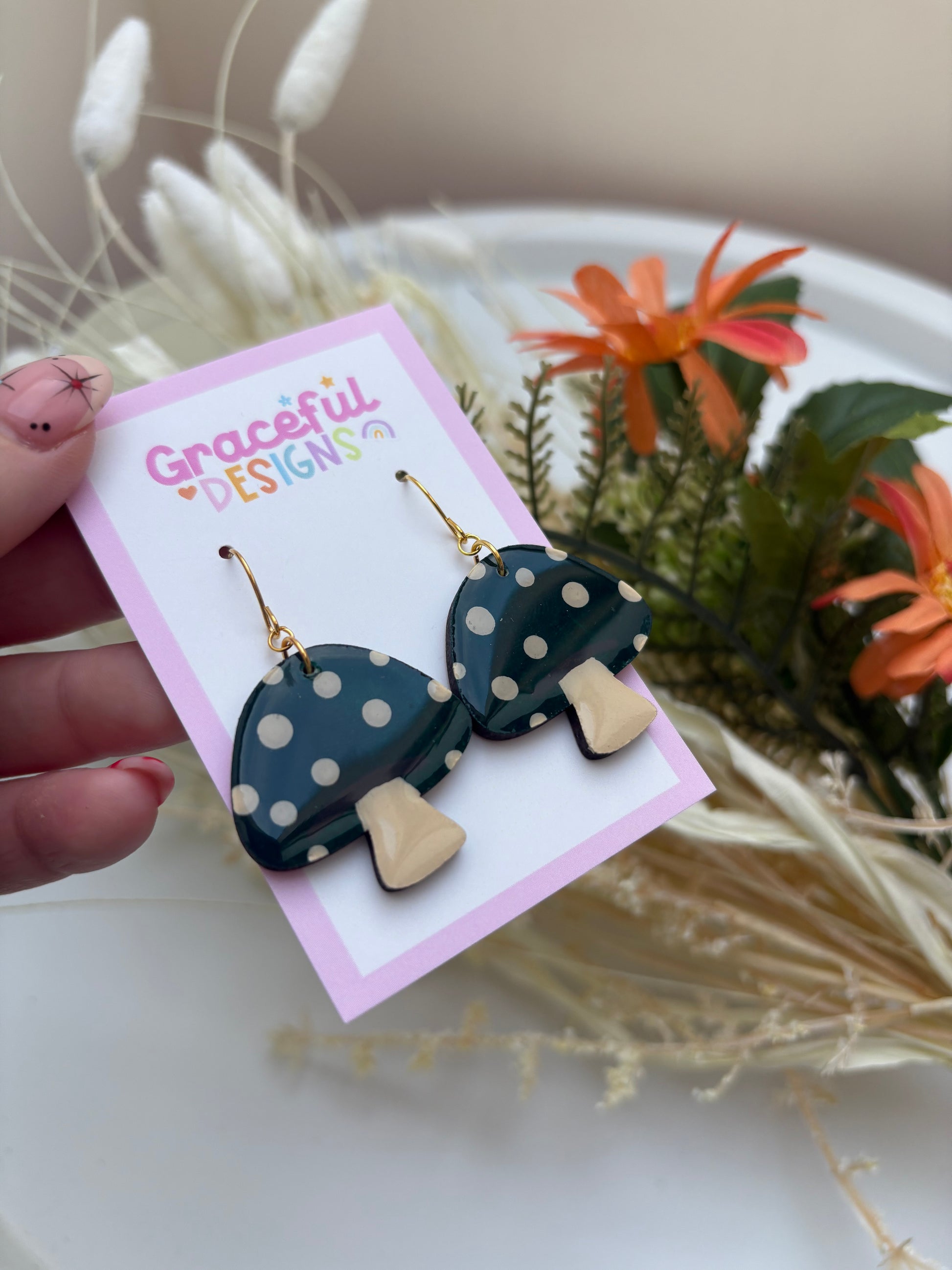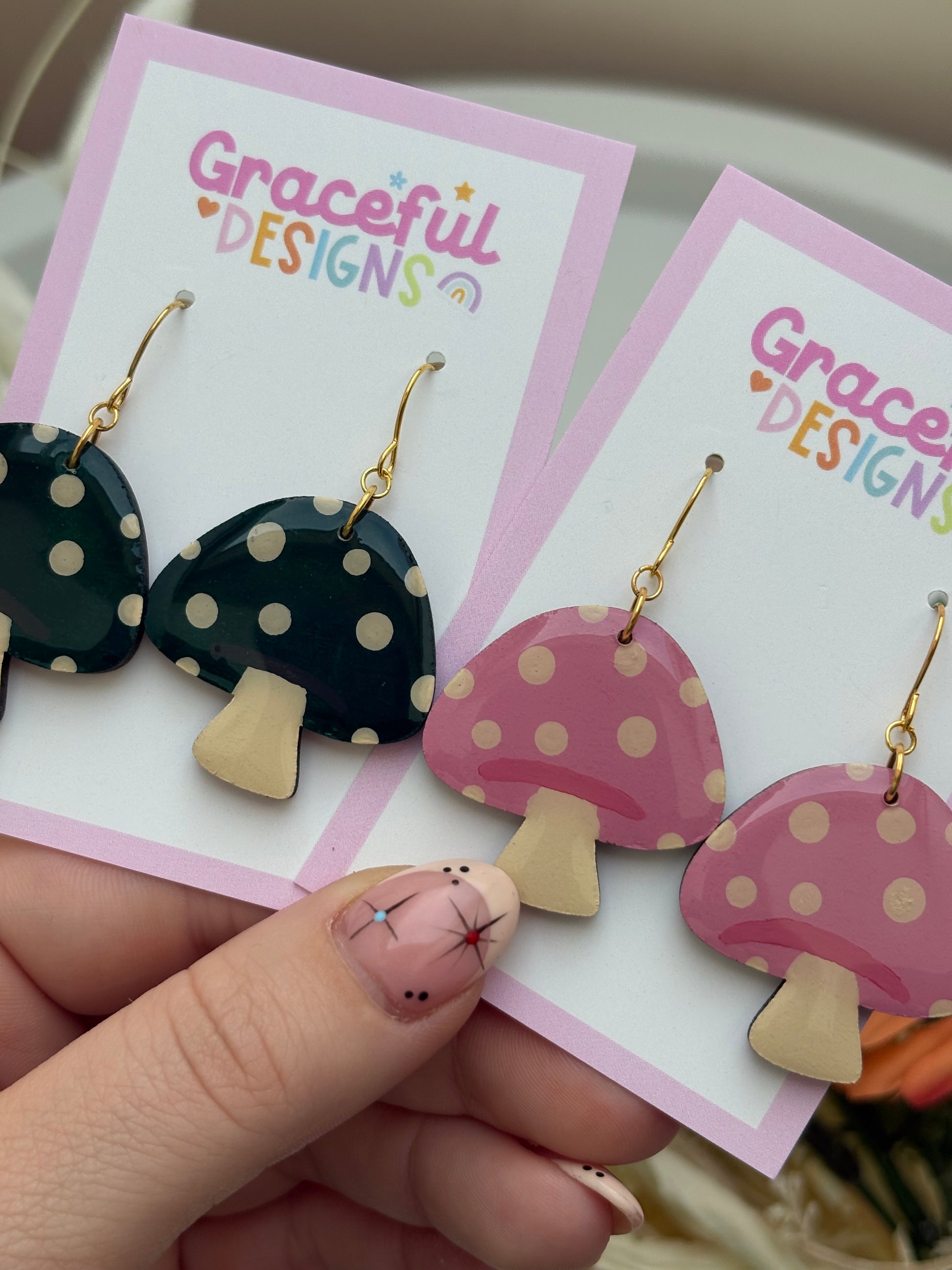 - Hand-painted toadstool charms with glossy resin finish