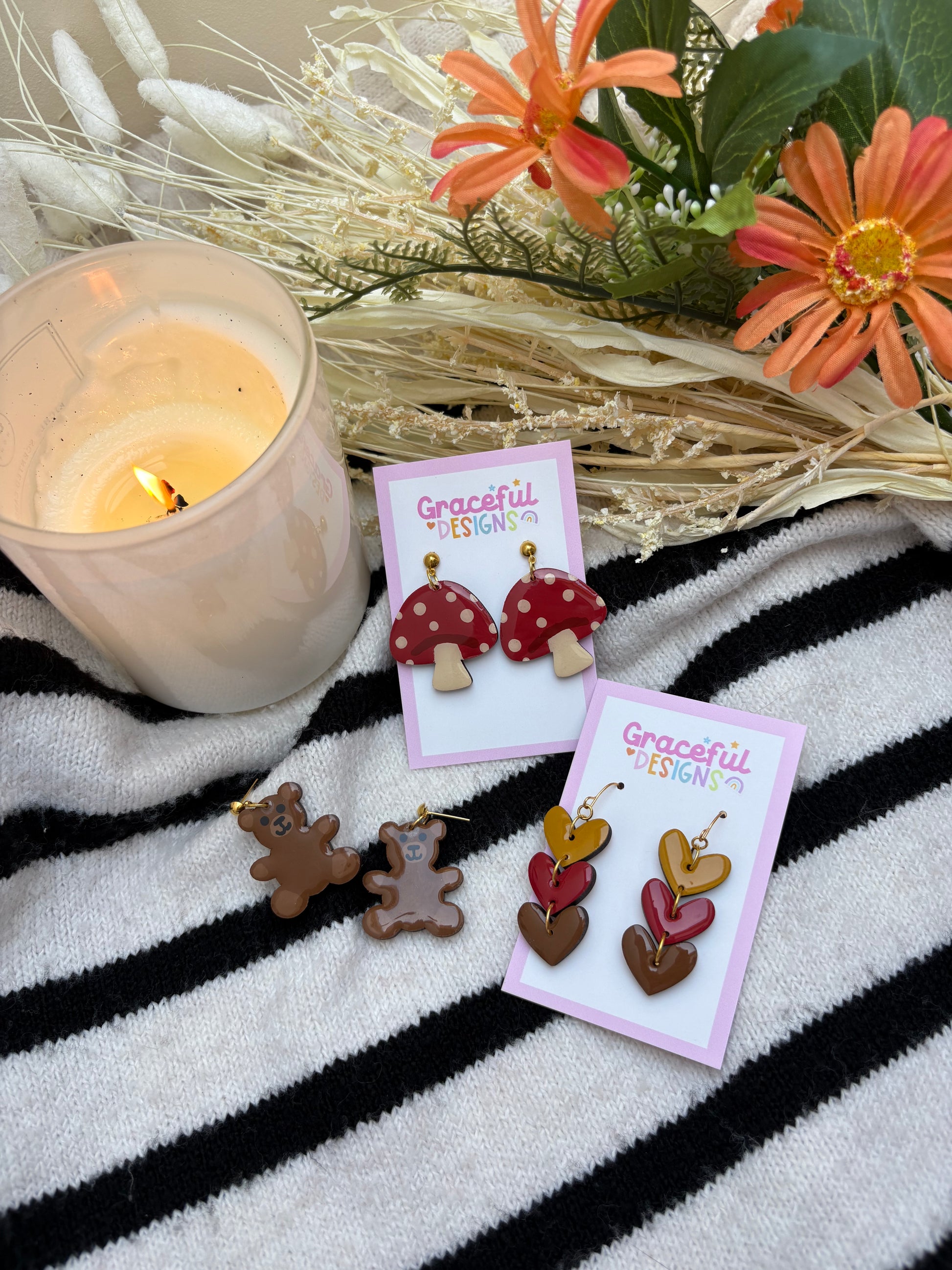 Whimsical, woodland, and oh-so-cute! The Toadstool Earrings are here to bring a little fairytale magic to your look. Each pair is hand-painted with bold polka dots and finished with a glossy resin shine, making them a standout accessory for cosy autumn fits or year-round cottagecore style. Choose your colourway to match your vibe, from classic red to dreamy pink or earthy green.